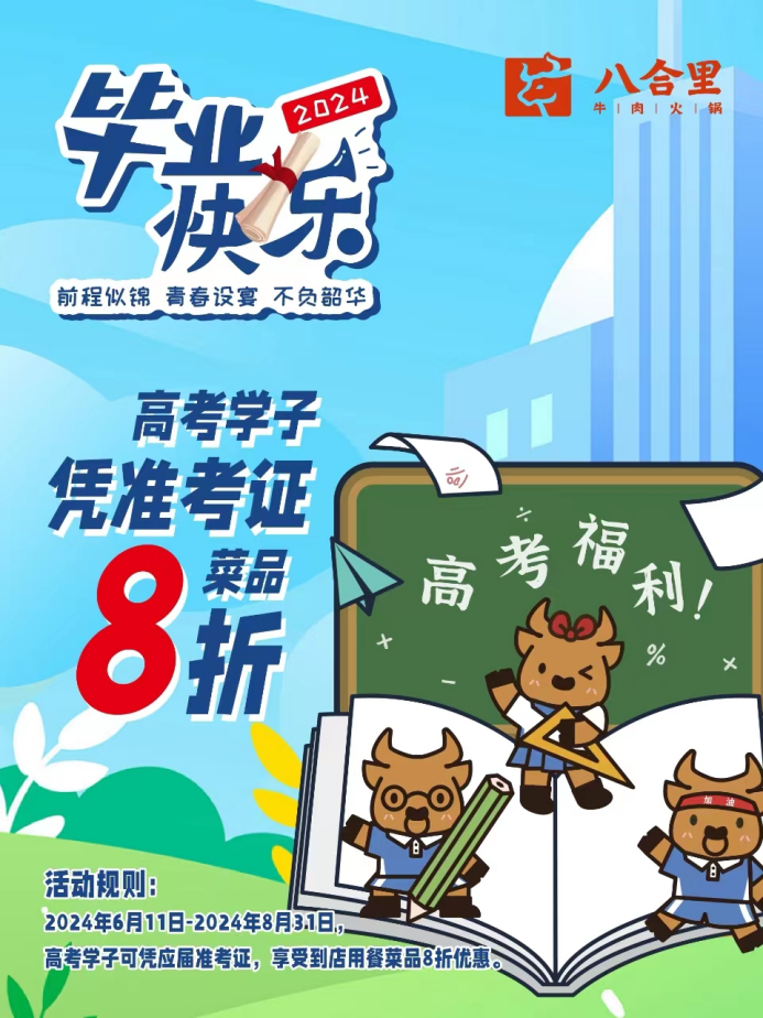 6月11日,八合里牛肉火锅通过公众号、微博等渠道放出“高考福利”。活动规定:“高考学子凭借应届准考证,可以享受到店用餐菜品8折优惠。”值得注意的是,活动从6月11日持续到8月31日。有网友表示:“这是一个暑假的火锅自由”!