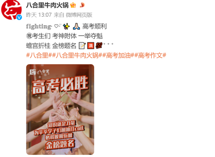 高考期间,八合里牛肉火锅也一直在关注高考学子群体。6月7日,八合里牛肉火锅在微博上为莘莘学子打call,祝考生们“考神附体,一举夺魁,蟾宫折桂,金榜题名”。