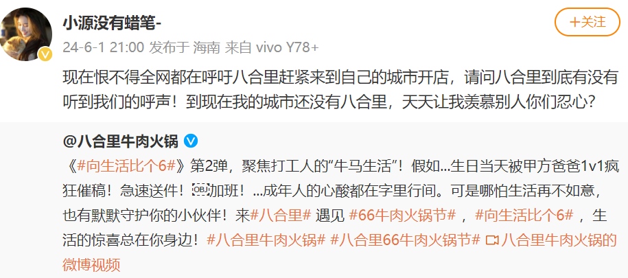 有网友发帖“全网呼吁八合里赶紧来到自己的城市开店”。