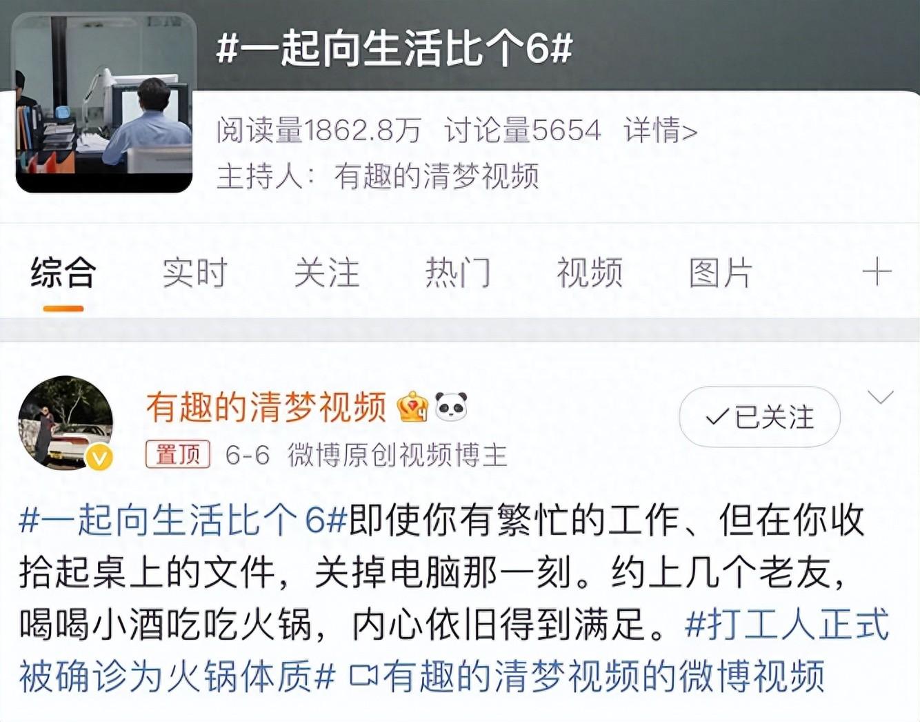 二是“双话题”,在《向生活比个6》坚持“日更”的同时,#向生活比个6#、#八合里66牛肉火锅节#双话题在微博、抖音等社交平台上同期推进,吸引网友互动。