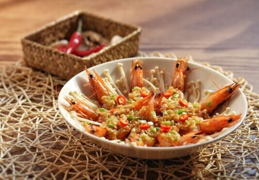蒜蓉蒸虾香气四溢,蒸出鲜美的汤汁被垫底的金针菇吸收,整盘都是好滋味。