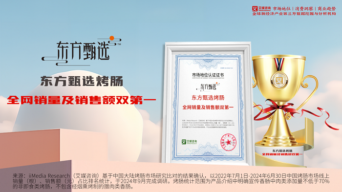 2024年9月,东方甄选烤肠获全球新经济产业第三方数据挖掘和分析机构iiMedia Research(艾媒咨询)授予的“全网销量及销售额双第一(统计范围:中国大陆市场2022年7月-2024年6月)”市场地位确认。