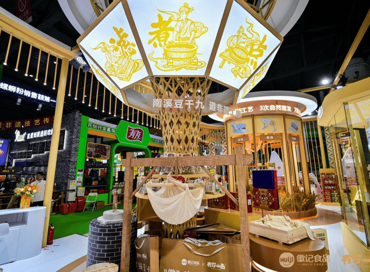 这些设计不仅与徽记食品旗下的豆制品产品相呼应,还传递出品牌对传统工艺的尊重与传承。暖黄色的灯光与木质材料的质感相结合,让整个展台充满了温暖与亲切感,仿佛将参观者带入了一个充满烟火气的传统磨坊之中。