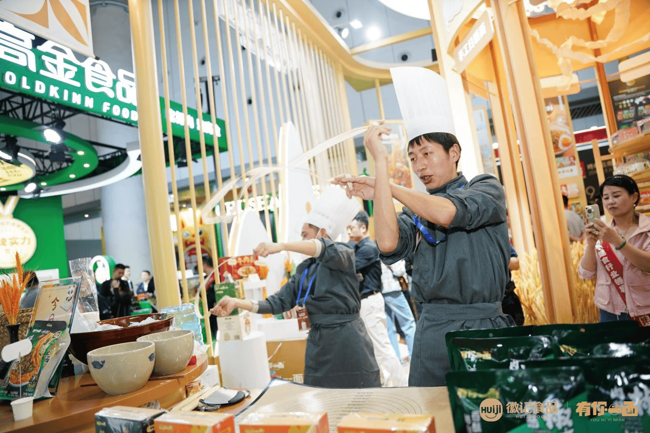 有你一面的展台则以面食文化为主题,将面条的元素巧妙地融入设计之中。悬挂的面条造型装饰、模仿面条自然晾晒圆形竹编装饰以及现场手工拉面的展示区,生动地展现了面食的制作过程和传统工艺,吸引了众多参观者的目光。
