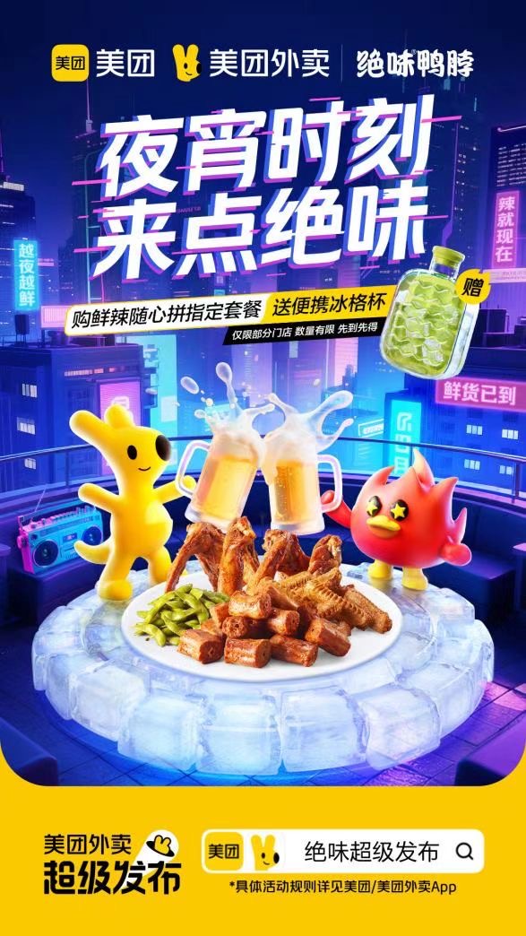 绝味鸭脖与美团外卖,一个以“四大领鲜承诺”为吃货提供新鲜美味,是“吃货中最强的新鲜搭子”;一个凭借“送啥都快”基因,是“生活里最强的全能伙伴”。绝味×美团超级发布以“冰辣CP”破局:当绝味的“鲜辣”撞上冰格杯的清凉,当夜宵变成“可玩可晒”的生活仪式感,便生成了一种触达年轻人的新语言。