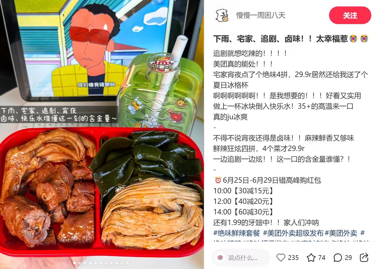 本次活动实现全网曝光5亿+,小红书话题总浏览1600万+,总互动2.1万+。这些亮眼的数据背后,是绝味鸭脖与美团外卖对年轻消费群体社交习惯与内容偏好的精准把握,除了在美团平台上的精准曝光,在达人种草策略上亦是可圈可点。
