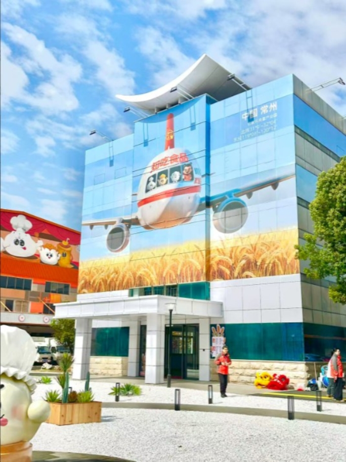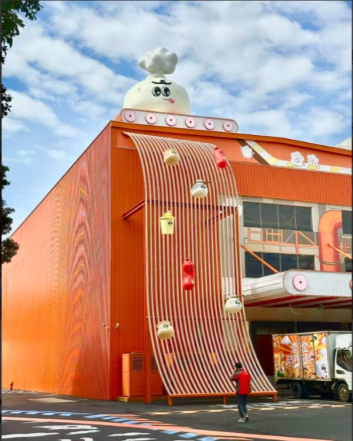 与传统工厂的工业感不同,这里更像一座温暖的“面点童话工厂”。明亮的橙色主调与生动的各类面点Q版形象融于各处,从屋顶瞩目的“会呼吸的包子”雕塑、彰显出海抱负的巨幅海报,到可互动击掌的包子装置、创意面点瀑布,遍布厂区的主题墙绘与趣味灯绘、地绘——每一处设计皆充满故事感与亲和力,让生产空间可触摸、可共鸣。