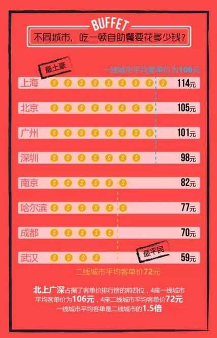 不光是自助餐这一业态,纵观餐饮业,客单价和成本控制之间的关系是一家餐厅是否拥有持续经营力的重要因素。八大城市自助餐客单价数据显示,一线城市自助餐平均客单价为106元,二线城市平均客单价为72元。考虑到酒店高端自助餐的市场份额,实际上其他自助餐的平均客单价要低于这一水准。
