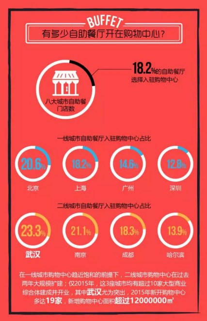 数据显示,在开在购物中心里的自助餐门店这一项统计中,武汉、南京、成都分别以23.3%、21.1%、18.3%的占比分列第1、2、4名。而这三座城市去年新开的大型购物中心数量分别达到了19、13和10家。