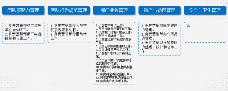 这份职责表没有具体指定要由谁来负责哪些事情。而一份科学的部门职责必须要从多个角度来考虑,首先是团队建设,包括凝聚力管理和行为规范管理。只有团队稳定且规范,才能确保战斗力。其次是与业务相关的角度,如部门业务管理、资产费用管理。在这里要强调一句,对餐饮行业来说,食品安全与卫生管理也是重头戏。于是有了下面这一版本的营销部门职责表。