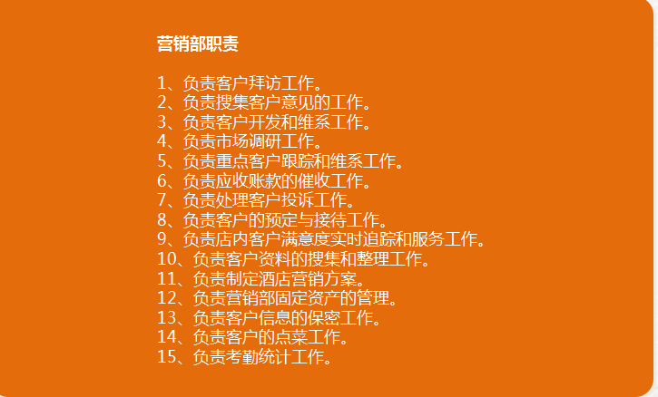 这份部门职责是比先前那一份更加系统和全面但却难落地执行。因为在精细化管理的思维里,编写部门职责的时候,如果只描述负责什么,这里面就一定有问题。比如负责客户的开发和维系工作这一项,怎么负责,要达到什么效果。很显然我们看不到执行的标准。