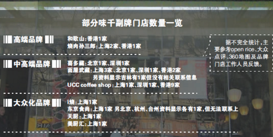 然而记者调查发现,味千拉面的这十余个副牌的存在感颇低。据不完全统计,高端品牌和歌山在香港有1家门店,烧肉孙三郎在上海有2家门店,根据香港美食指南open rice显示,香港2家门店其中1家已结业。中高端品牌喜多藏在北京和深圳各有1家。据知情人士透露,UCC coffee shop在香港也有近半门店结业,而在国内市场也只有2家门店,且有消费者表示,服务和产品远不及香港门店。