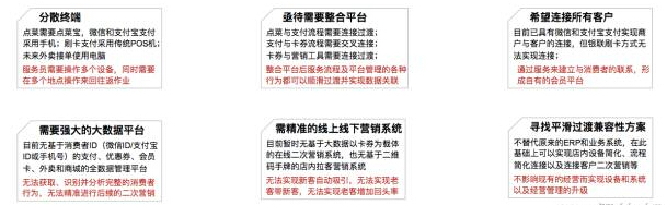 分散的终端给服务员增加了大量的工作。餐厅点菜时需要点菜宝,用微信支付宝等支付时,需要的终端是手机,传统刷卡支付需要传统 POS 机,服务员往往需要往返多次,耗时耗力。这种情况下,急需要一个整合的平台,可以实现从点菜到支付的一体化的连接,支付与卡券核实的连接,卡券与营销工具的连接。整合后的平台,可以让服务流程与平台管理的各种行为顺利过度并实现数据关联。