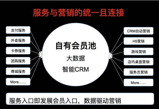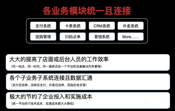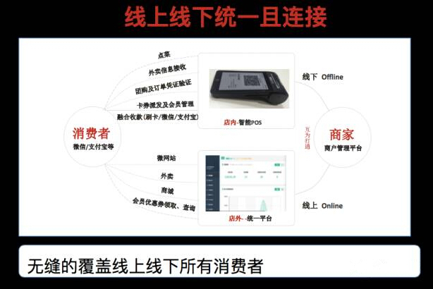 所有系统的商家通过统一平台,实现打通,从而无缝的覆盖线上线下所有消费者。比如餐厅的一个消费行为,不管是从外卖平台过来的,还是从团购中过来的,抑或直接从线下过来的,只要消费,就从同一终端进行解决,然后后台同一系统进行记录和跟踪消费者数据。