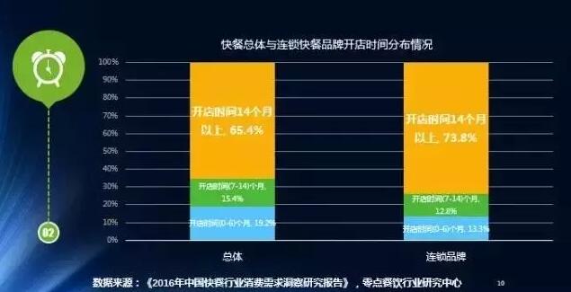 从现存的店铺来看,连锁快餐存活2年以上的店的比例高于快餐店总体,所以,连锁快餐品牌的店铺在市场上存活得更久。