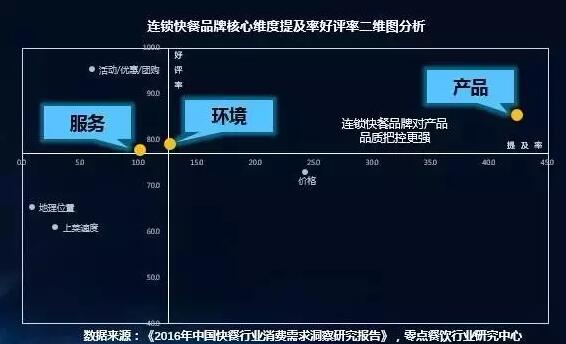 下图所示,横轴是提及率,纵轴是消费者的好评情况,可以看到,连锁快餐品牌的产品、环境和服务维度的好评率都较高,是三大优势,由于品牌化,使得服务流程标准化、对产品品质把控更强,这三个维度更受消费者认可。