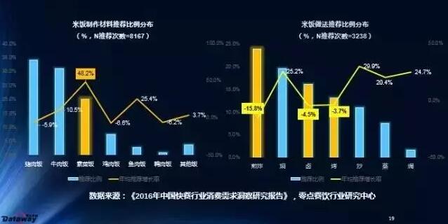 从制作材料来看,虽然现在还是以猪肉和牛肉饭推荐最多。但是,素菜类菜品受推荐的年均增长率为最高,也就是说,以素菜为主材料的产品越来越受消费者认可。