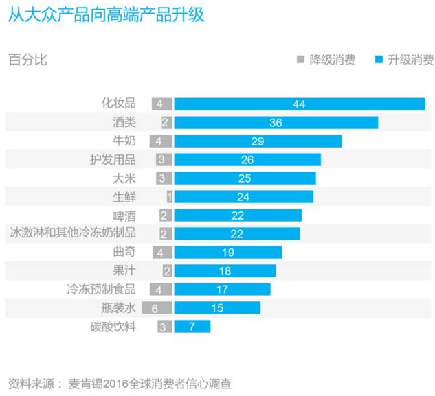 消费升级正呈现出旺盛的势头和活力,高端产品的品类增速超过了大众产品和价值型产品的品类。而消费量—尤其是食品和饮料——则增长乏力。