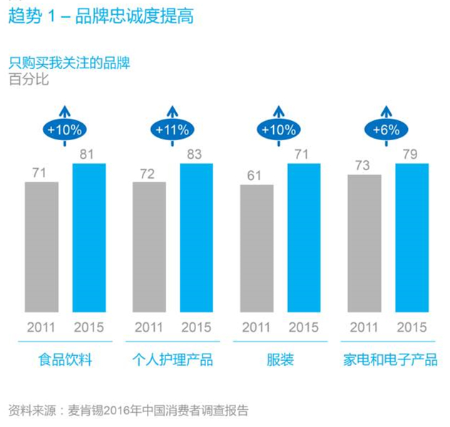 越来越多的中国消费者开始只关注少数几个品牌,其中一些人则进一步锁定某一个品牌。中国消费者并不很愿意在自己关注的品牌之外购买其他品牌。例如在服饰品类,愿意选择备选品牌之外的消费者比例,已经从2011年的约40%降至2015年的不足30%。