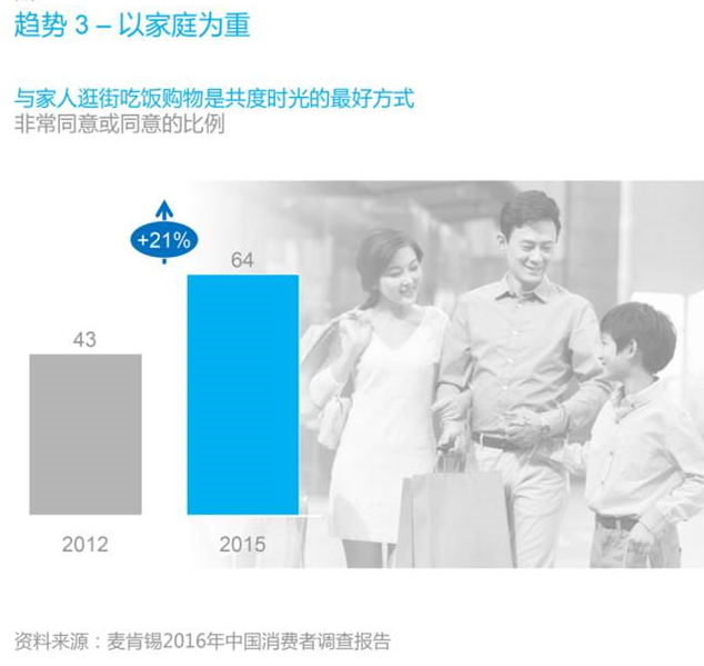这一趋势为消费品行业带来了深远的影响。尽管电子商务风生水起,“购物休闲体验(retailtainment)”却越来越吸引着人们。三分之二的消费者表示,逛街吃饭购物是与家人共度时光的最好方式,与3年前相比上升了21%。