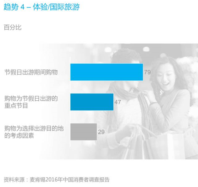 2015年中国出境旅游超过7000万人,平均每人1.5次。购物是中国消费者境外游的“保留节目”:80%的消费者在海外购物,将近30%的人甚至根据购物机会来决定旅游目的地。