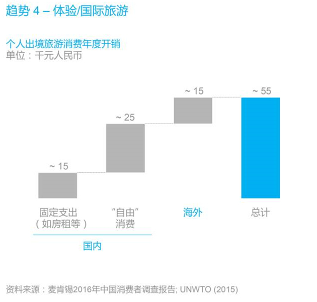 对于7000万出境游的中国人,海外旅游占到其个人年度开支的25%。从境外消费构成看,旅行相关开销占到一半,另一半都用在了购物,他们的手表和手袋有一半购自海外,服装和化妆品是最热门的购物品类。