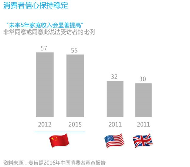 当被问及未来收入预期时,55%的受访者相信未来五年中自己的收入将显著增长,较2012年仅下降2个百分点。相比美国和英国,2011年持这一说法的消费者分别为32%和30%。