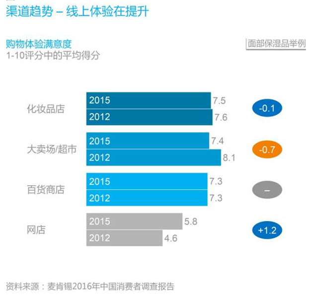 消费者对实体店的满意度仍然比在线渠道高,但随着网购越来越受欢迎,线上和线下渠道的满意度差距正在缩小。
