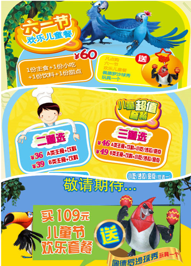 2014年,美国3D电脑动画音乐喜剧冒险片《里约大冒险2》在中国热映,许多孩子对动画当中聪明可爱的鸟儿们印象深刻。就在影片上映后不久的六一儿童节里,必胜客推出了儿童套餐。为了给孩子们制造节日惊喜,必胜客选择了《里约大冒险2》当中的一只明星鸟儿“佩德罗”作为随餐玩具,受到了孩子们的追捧。