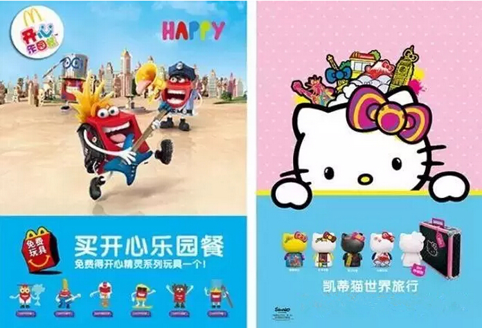 就在去年的六一儿童节期间,麦当劳推出了新玩具,但这次不同往常,并非单推一款。若顾客购买了开心乐园套餐,则可以免费得到一个“Happy”玩具;若顾客任意消费再加25元则可获得一款可爱的“Hello Kitty”玩具,甚至加138元可获一整套。