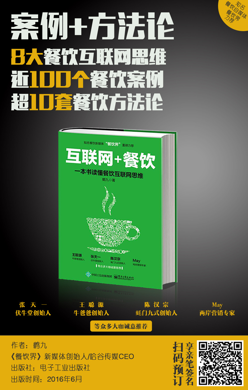 作为知名餐饮自媒体人,“餐饮界”创始人鹤九将自己亲身经历的经验与知识进行系统的梳理,并对多年总结而来的餐饮互联网思维精华进行了提炼,撰写了《“互联网+餐饮”:一本书读懂餐饮互联网思维》一书。