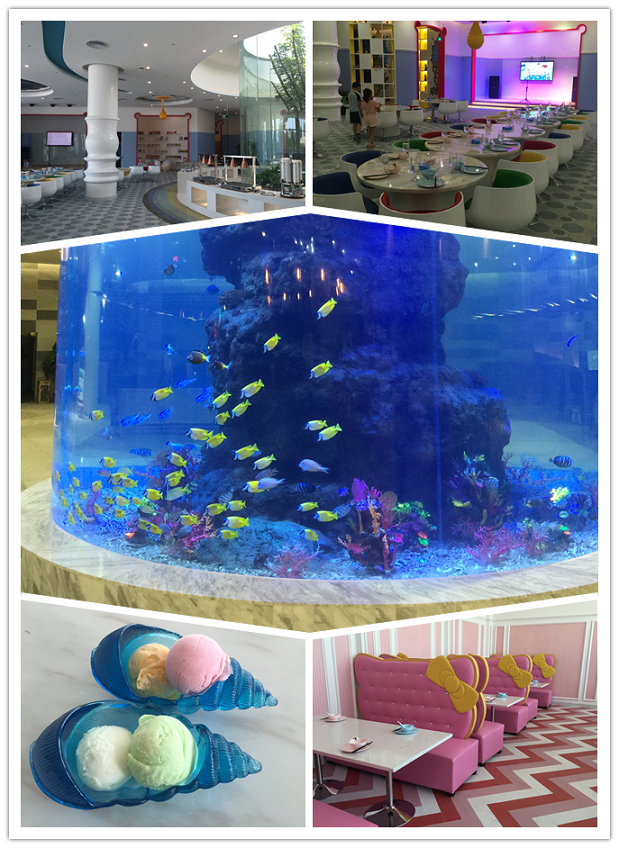 餐厅专门打造了梦幻十足的Hello Kitty区。粉色不仅是凯蒂猫最爱的颜色,也是最能彰显小公主们气质的颜色。粉色控的小女孩们可以在这里和Hello Kitty一起度过美妙的时光。而在餐厅中央大厅处,设置了多个圆柱形的海洋动植物玻璃缸,各种叫不出名字的奇妙鱼类在其中畅游嬉戏,仿佛置身于水族馆一般。餐厅墙面上,则绘制有多啦a梦、大头儿子小头爸爸等众多深入人心的卡通形象。