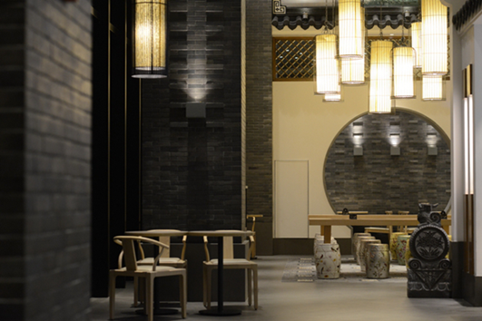 该门店除提供智能点餐外,还有无线充电桌,这家餐厅的环境布置也和普通门店不同,绿竹、花窗、月门及粉墙黛瓦等元素非常有"新中式"的特点。