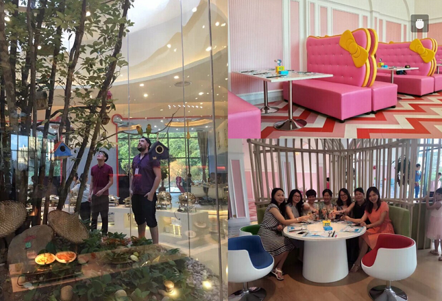 从餐厅大门进来,一眼就能看到趣味可爱的鸟笼餐区。置身于木质的巨大鸟笼,被各类绿色植物包围其中,仿佛穿越到了巨大的国度,让人大呼过瘾。而在餐厅入口的右方,则是梦幻十足的Hello Kitty餐区。餐区以粉色为主色调,充满幻想的设计,让孩子们一秒变公主。