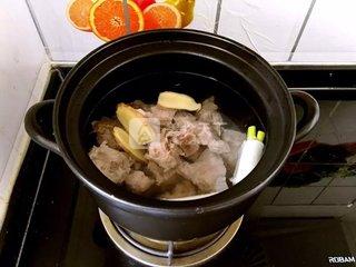 4、砂锅内放入红豆、薏米、排骨、葱、姜、料酒,倒入适量热水。用大火烧开,撇去浮沫。再开用小火煮约20分钟。