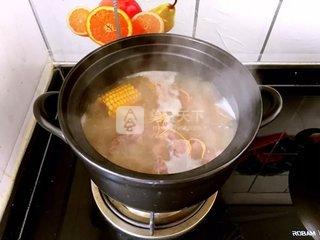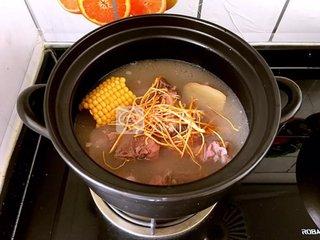5、放入玉米段,再用旺火烧沸20分钟。最后倒入鲜虫草花,再续煮15分钟。